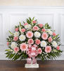 A wide selection of fresh pink and white flowers such as carnations, daisies, lovely seasonal blooms, and accents of luscious greens are featured in this basket arrangement. Send this thoughtful gift to the home of the bereaved family and your sentiments will be portrayed. You may also send this to a funeral home for visitation. We offer free funeral home with this beautiful basket.