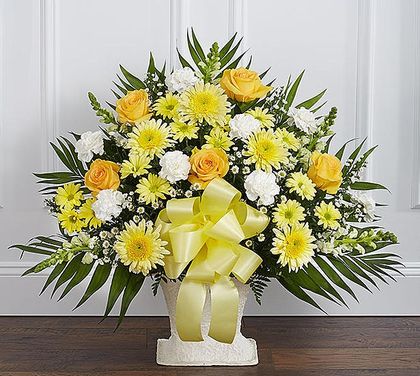 Beautiful shades of yellows and whites are artistically designed in a floor basket container and tied with a yellow satin bow. Perfect for sending to a funeral home or church service to show your condolences while honoring the life of a special someone who has passed away. You may upgrade this to include even more flowers and we offer free funeral home delivery with this basket.