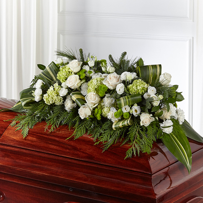 Celebrate the life and pay homage to a loved one with our stunning Hopeful Gesture Casket Spray by FTD. This exquisite flower arrangement is a beautiful way to tribute with its elegant green and white accents. The combination of winter greenery and exotic leaves creates a captivating choice that will make the final farewell truly memorable. The delicate white blooms symbolize purity and peace, while the lush green foliage adds a touch of serenity to the arrangement.